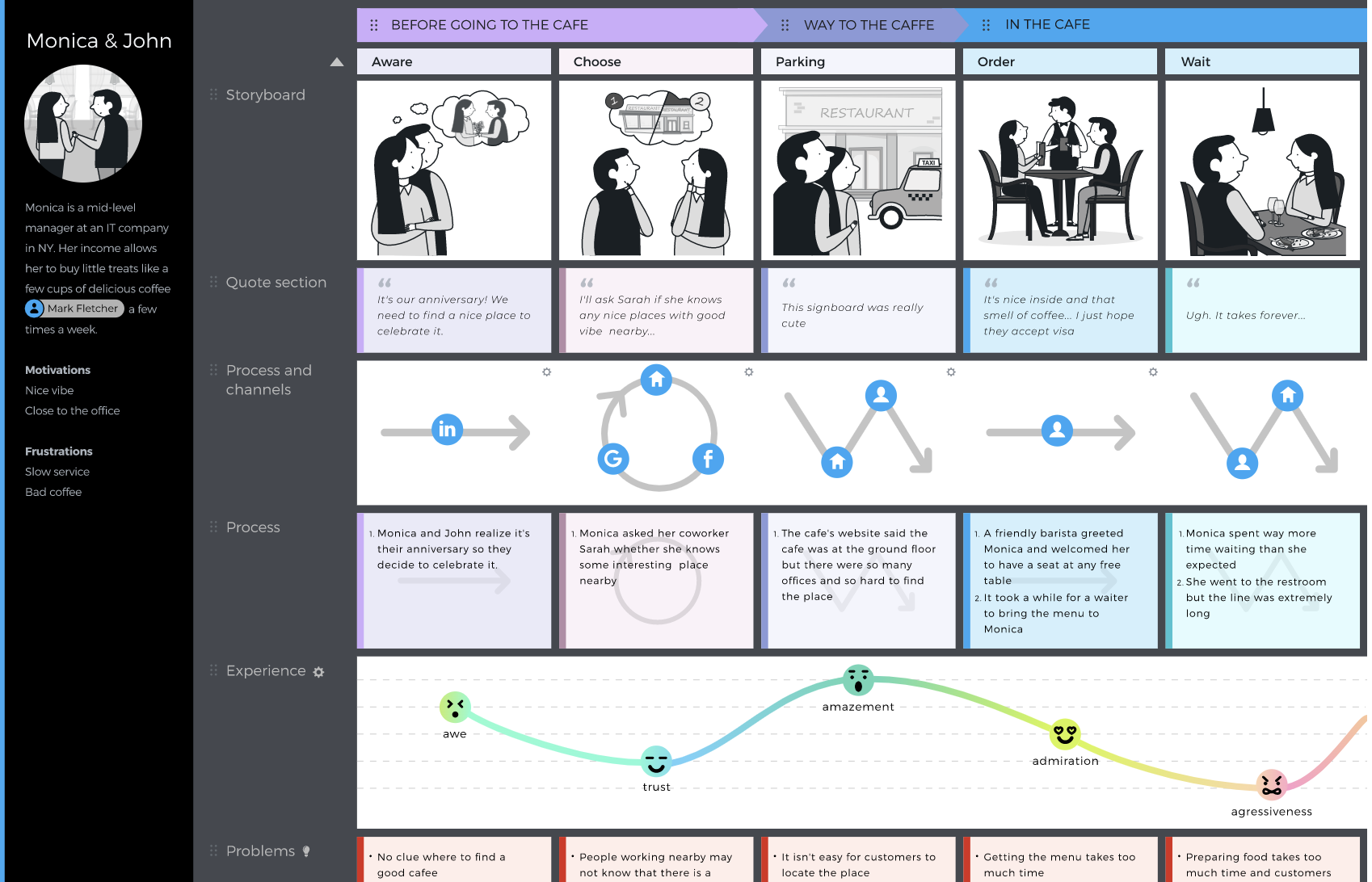Streamline your user experience initiatives with Visual Paradigm’s customer journey mapping and development tool. With the ability to link specific touchpoints, customer emotions, and customer pain points, you can quickly brainstorm and collaborate on maps with your team and stakeholders.
